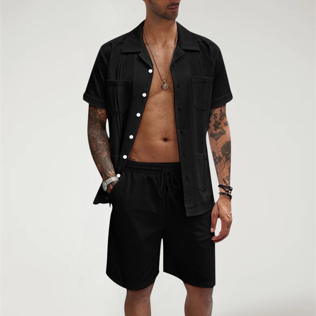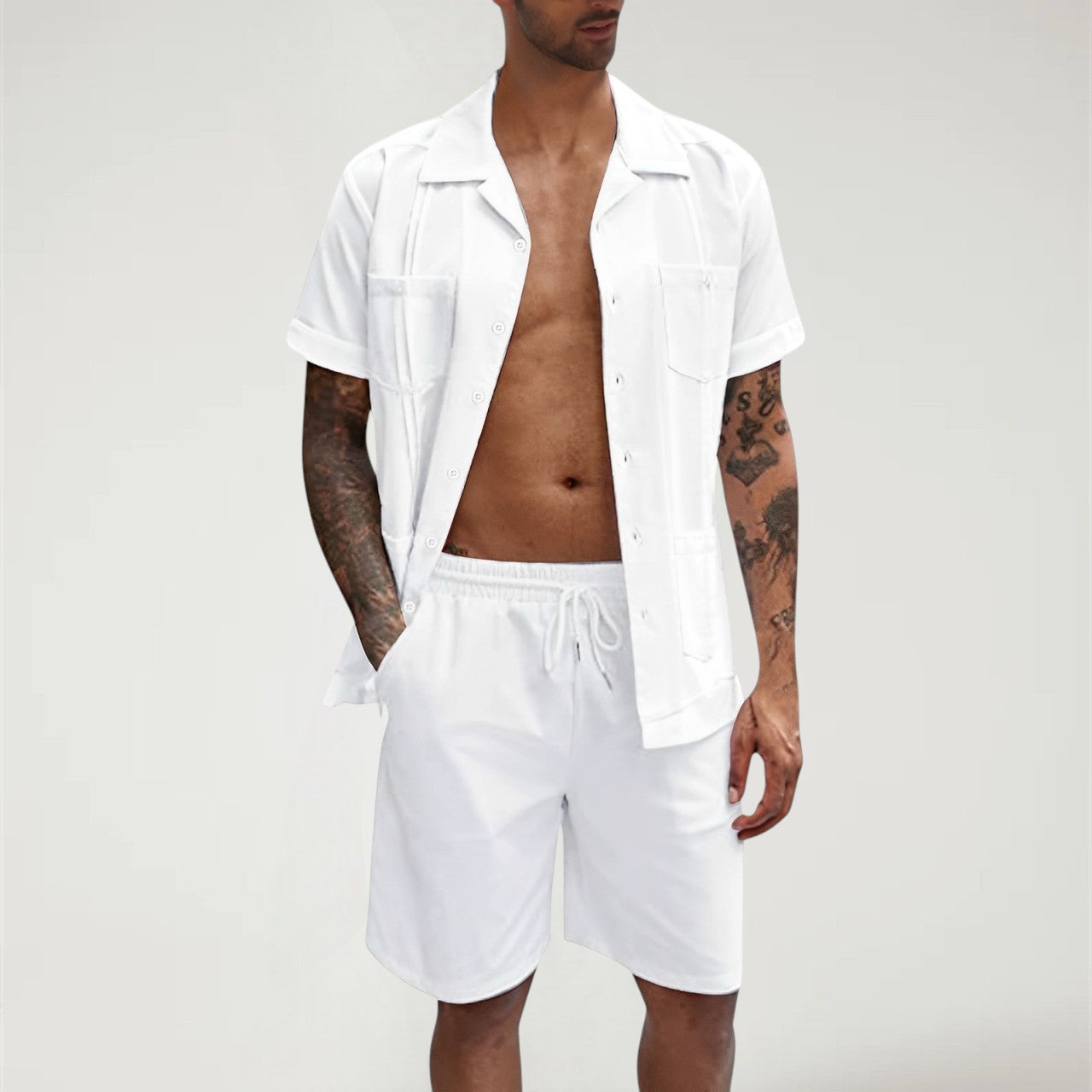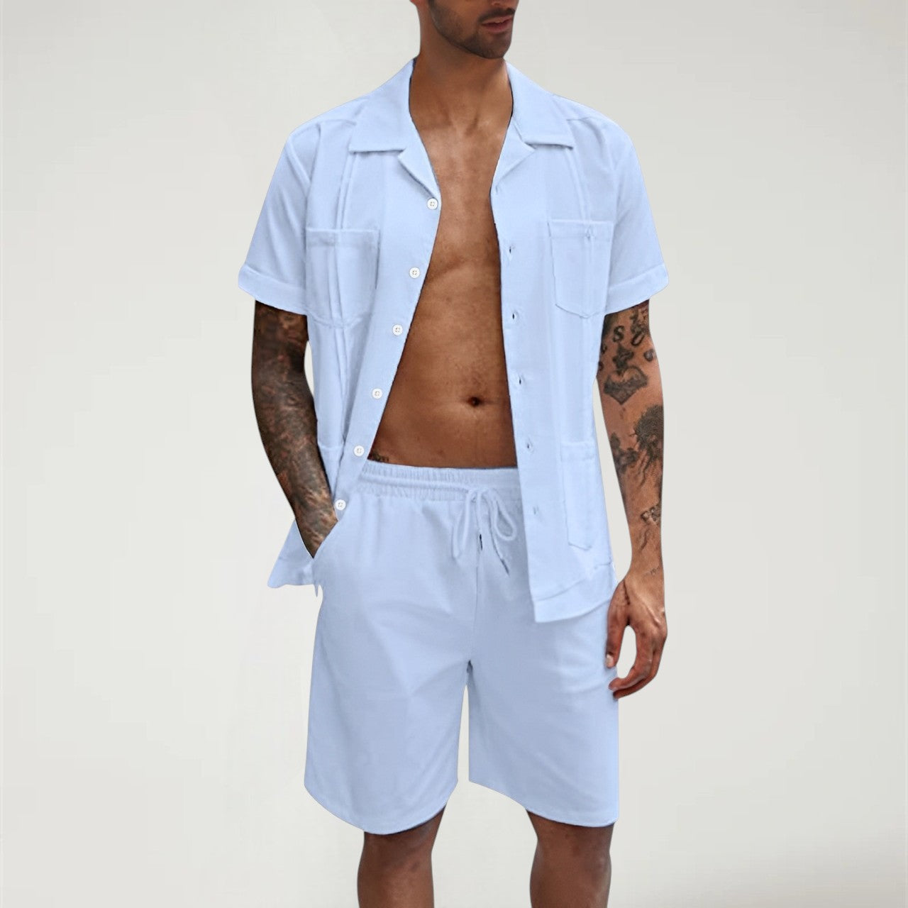 Stay fresh and relaxed in this Light Blue 2-Piece Summer Set. With a breathable short-sleeve button-up and drawstring shorts, it’s your go-to for vacation, beach days, or laid-back weekends.