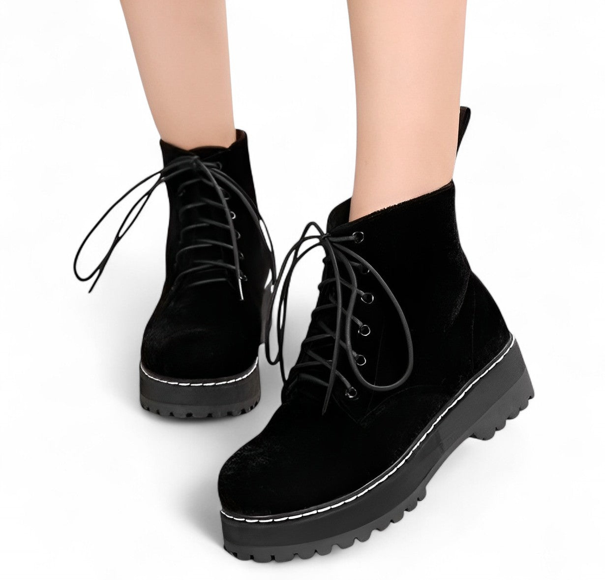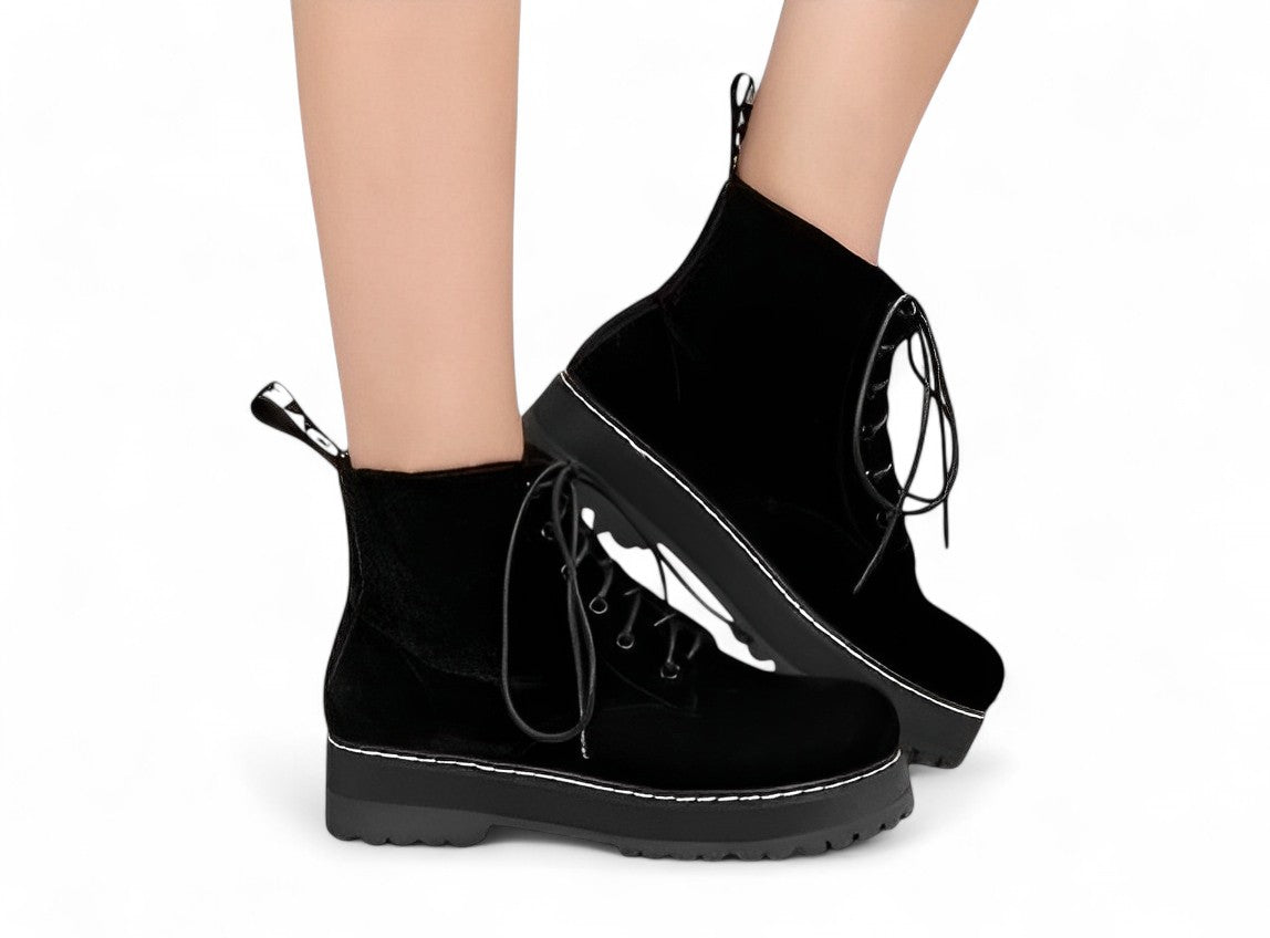 Elevate your step with these sleek and modern Black Lace-Up Platform Boots – the perfect blend of edgy and elegant. Designed with a smooth velvet-like upper and finished with a bold sole and contrast stitching, these boots deliver both comfort and statement style.