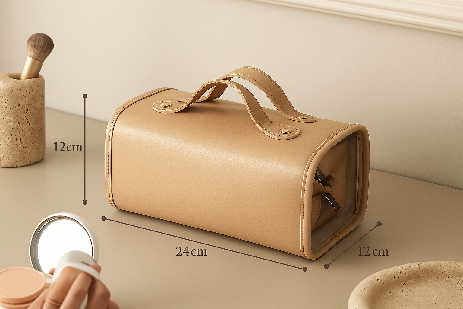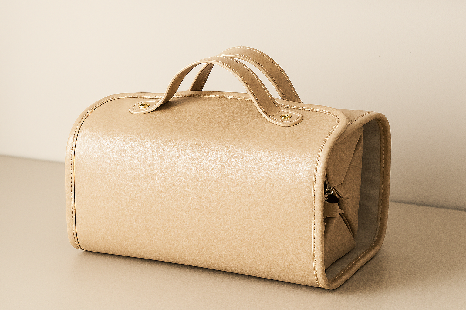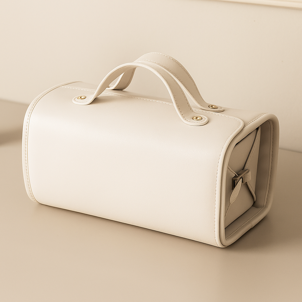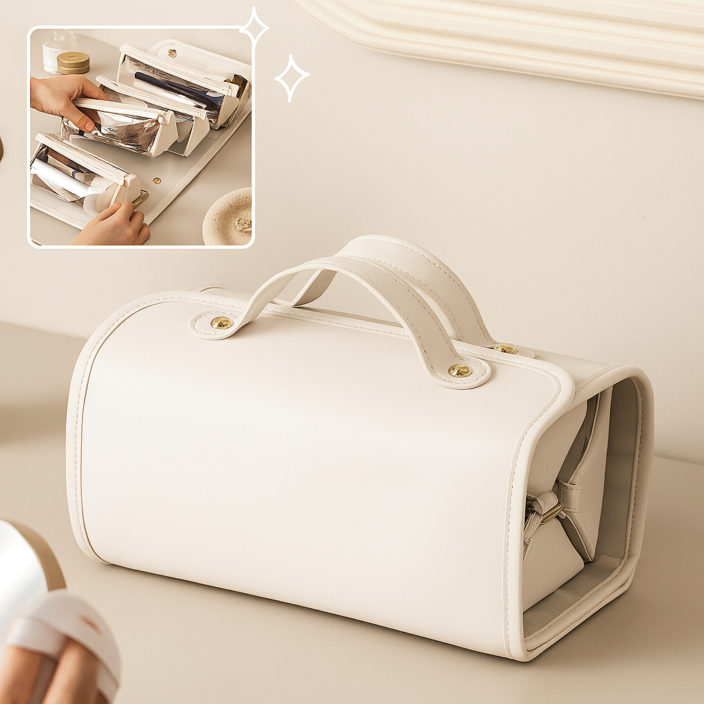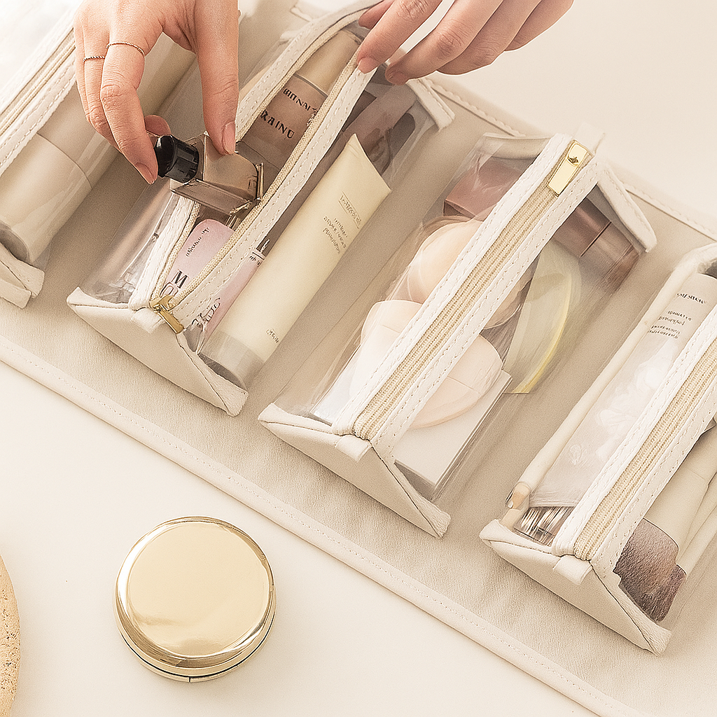 Reis in stijl en houd alles overzichtelijk met (ELENA). Deze elegante organizer combineert klasse en functionaliteit dankzij de oprolbare indeling met transparante vakken – perfect voor make-up, skincare en kleine essentials.
